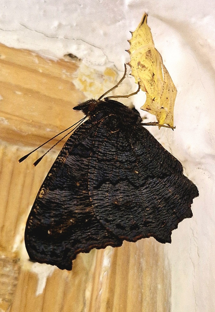 Здесь бабочка-нимфалида павлиний глаз Nymphalis io расправила крылья прямо на оболочке куколки, из которой она и появилась.