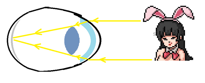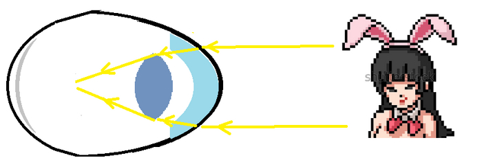 Лучи света преломляются (изменяют направление) роговицей, затем они преломляются хрусталиком, и в итоге попадают на сетчатку. Сетчатка детектирует девочку, посылает сигнал мозгу, мозг получает удовольствие. Преломляющая сила роговицы примерно в два раза выше таковой у хрусталика. А ещё хрусталик умеет менять свою форму (изменяя таким образом свою преломляющую силу), позволяя нам одинаково хорошо фокусироваться и на далеких, и на близких аниме девочек. Запомните эти два факта, они нам потребуются в дальнейшем.