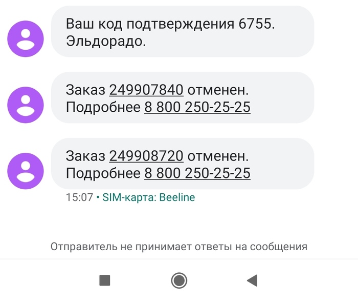Окей, не беда, повторю заказ ещё раз. Благо тут все интуитивно понятно. Жду. Спустя какое-то время вновь СМС и вновь сообщение о том что "Заказ отменён клиентом". Помимо всего прочего в сообщении был указан телефон, по которому я решил узнать причины отмены заказа (всякое бывает, может быть в наличии нет?). Звонка от магазина, кстати, так и не было.
