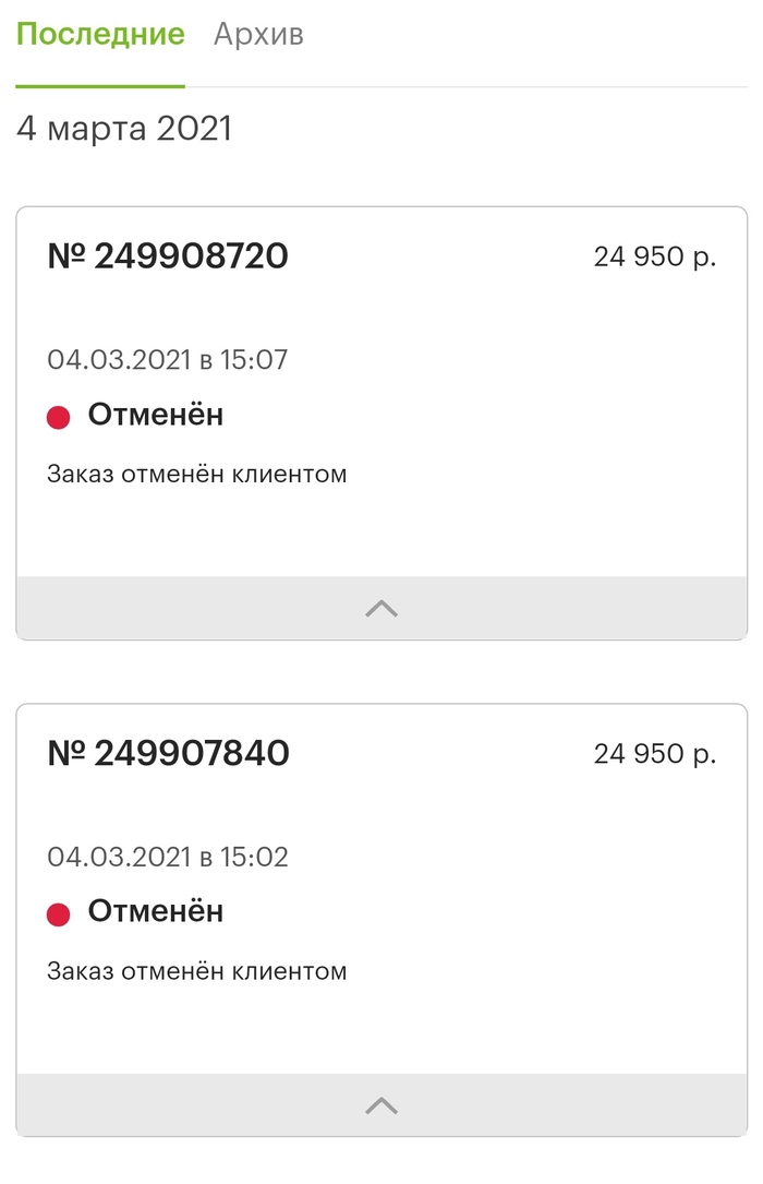 Зайдя в личный кабинет я действительно увидел, что заказ имеет статус "Заказ отменён клиентом", что было весьма странно, так как я точно помню, что этого не делал.