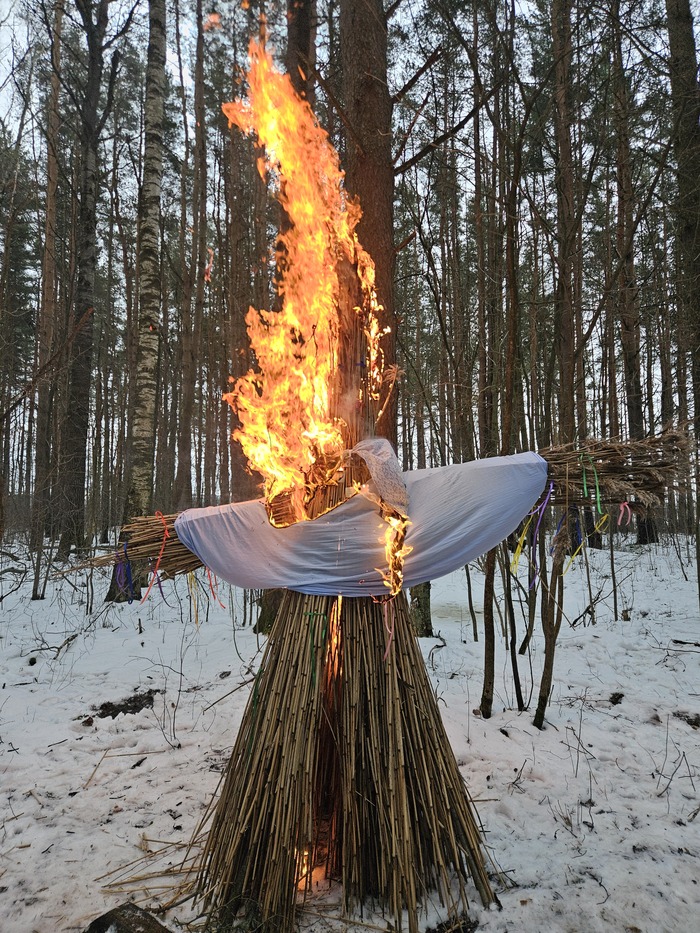 Дорога была то асфальтовая, то узкие заснеженные лесные тропы, где скорость передвижения сильно падала, но зато ехать было интереснее) На месте будущего сожжения чучела нас ждал согревающий костерок.