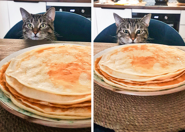 Сегодня всё было вкусно, блинчики заранее разрезаны. Я проверил сначала их температуру. Они не были горячими.