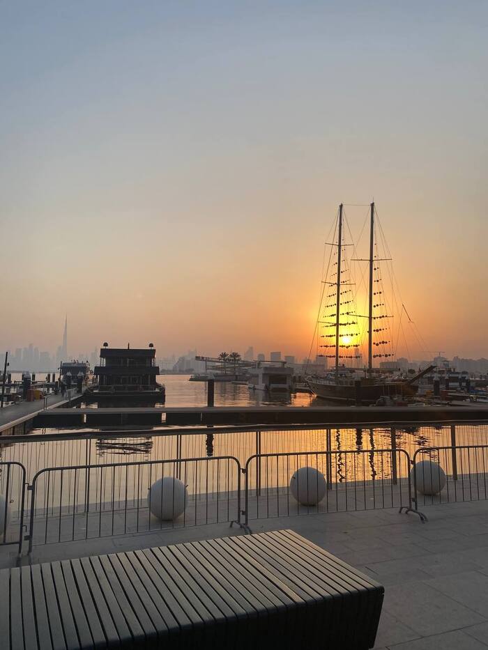 После нас отвезли в современный прибрежный район Дубая - Харбор, чтобы там дождаться заката. Красивое место, где тоже много туристов, все ходят, фоткаются и просят их сфоткать.
