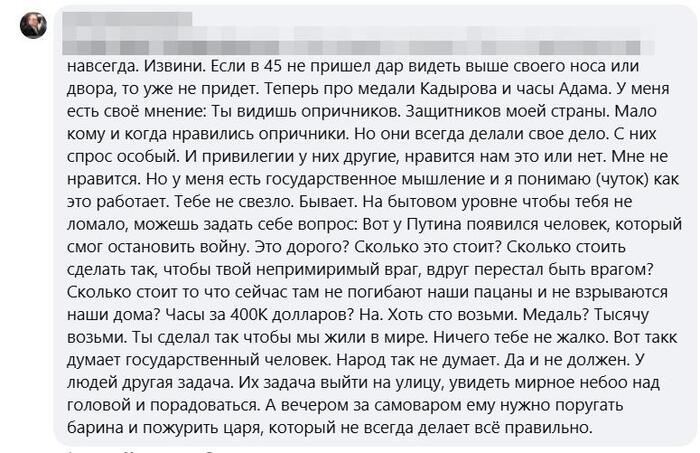 Сделка работает. Мы не просыпаемся под новости о взрывах (хлопках). Мы не боимся ездить в автобусах. Наши парни не бегают по горам в поисках непримиримых. Люди которые клялись сражаться с нами до конца жизни, сейчас сражаются на нашей стороне и отдают свои жизни за нас.
