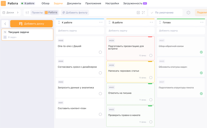Не забывай обновлять систему: двигай карточки по этапам работы, вычёркивай закрытые задачи и добавляй новые планы