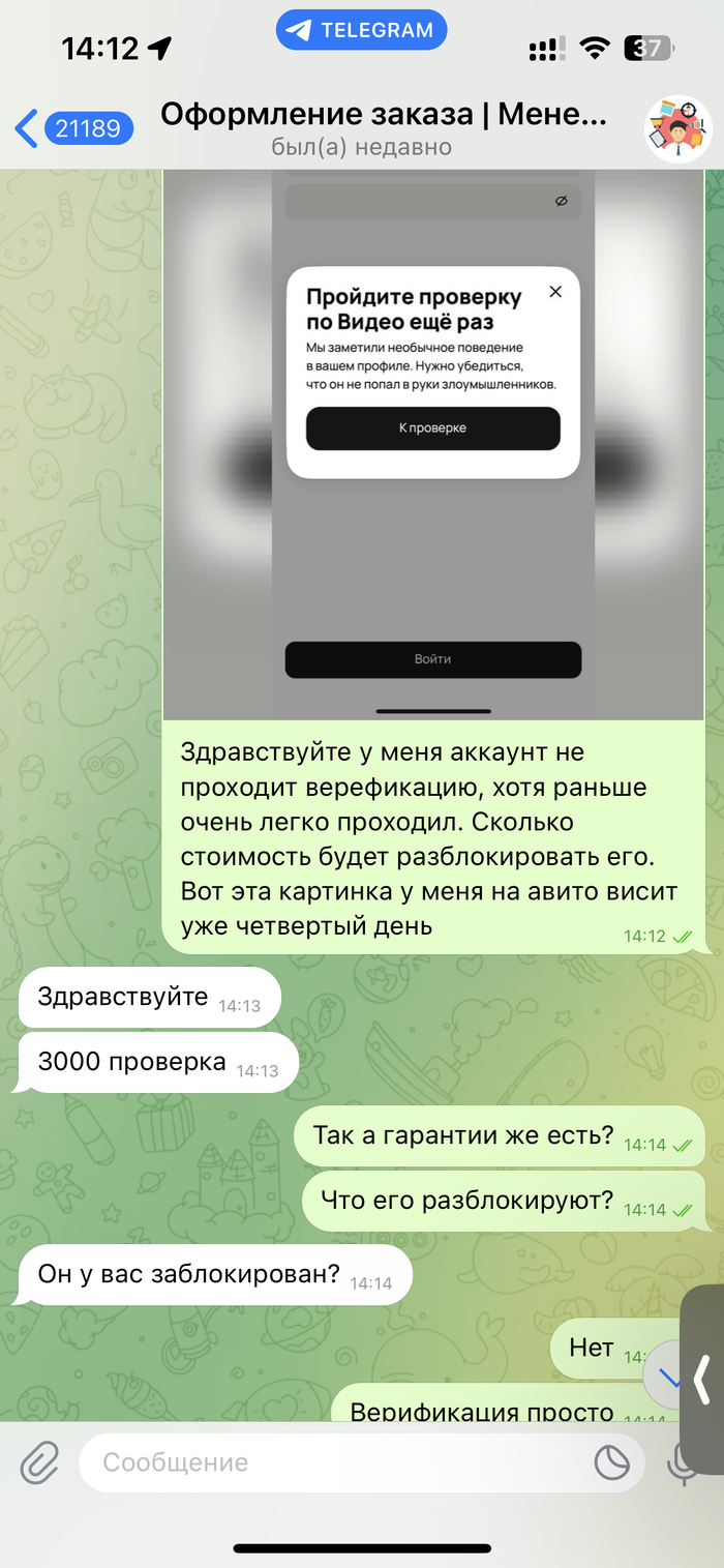 📛 Канал занимается обманом пользователей, предлагая услуги в сфере авито ( верификация, покупка отзывов, разблокировка и т.д), а после получения денег первый день выходит на связь, а на следующий день блокирует. Никаких обязательств они не выполняют.