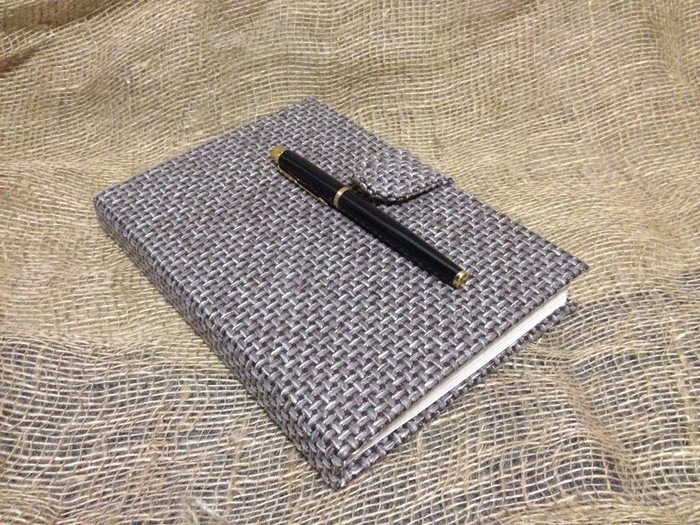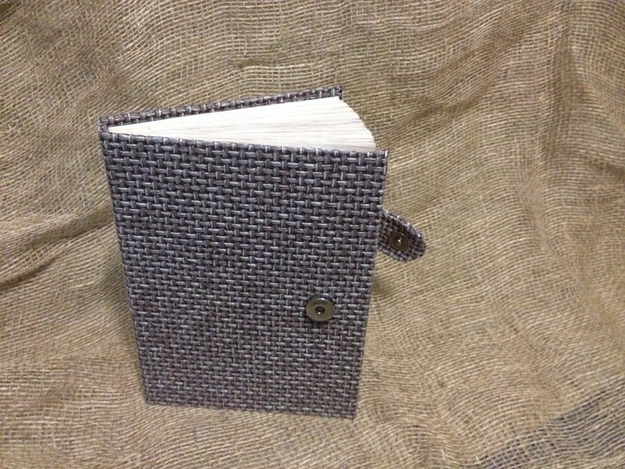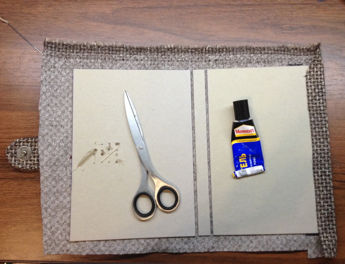 Теперь приступаем к обложке. Материал я взял рогожку, вырезал картон по размеру и приклеил все на тот же "гель". Сохнет недолго.