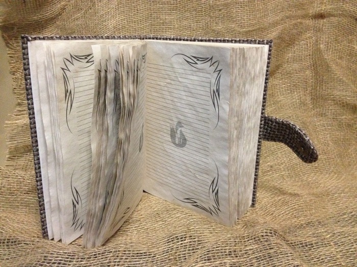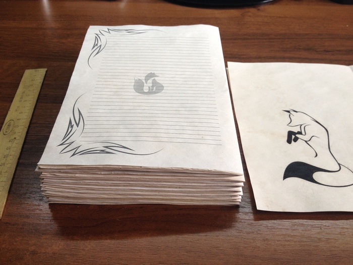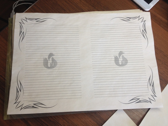 Приступаем. Для начала я сделал в фотошопе макет самих страниц и двух листов - титульного и... и последнего. Изображения лис брал в сети, немного редактировал, затем помещал на страницах. После чего отпечатал на лазерном принтере и приготовился к тонированию и состариванию листов. Тонировку проводил смесью чая, кофе и корицы. Чтобы пахло. Бумагу высушивал, расстелив простыни на полу и аккуратно разложив все листы, чтобы они не соприкасались друг с другом. Сушка заняла часов 5. Такую бумагу (офисная А4) лучше не держать долго в растворе, ибо она начинает рваться и аккуратно манипулировать ей становится очень трудно. В общем, на данном этапе получилось вот что: