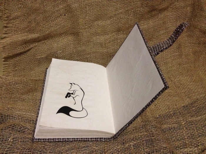 Тут же видно хлястик, который я сшил, пока высыхал клей. Блокнот будет на магнитной застежке. Потом, значит, загибаем края ткани, подрезаем, мажем клеем... А опосля вставляем внутрь блок листов и приклеиваем их к основанию. На клей ПВА фиксируем два крайних листа с изображением лисичек (под них я наклеил ватман, чтобы края ткани не угадывались) и оставляем сохнуть.