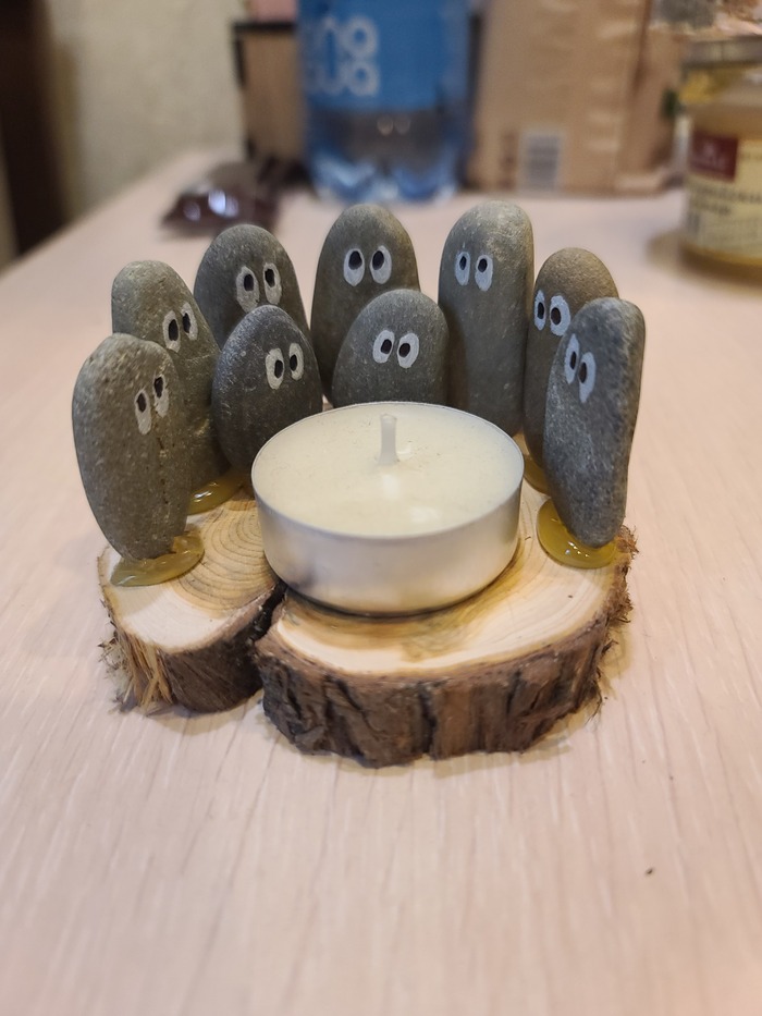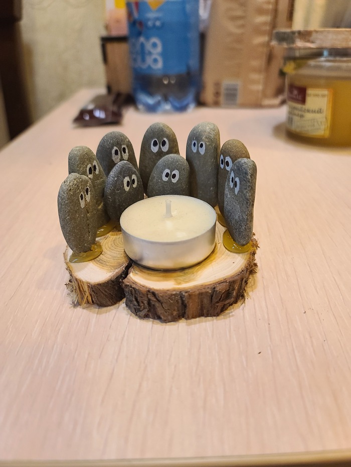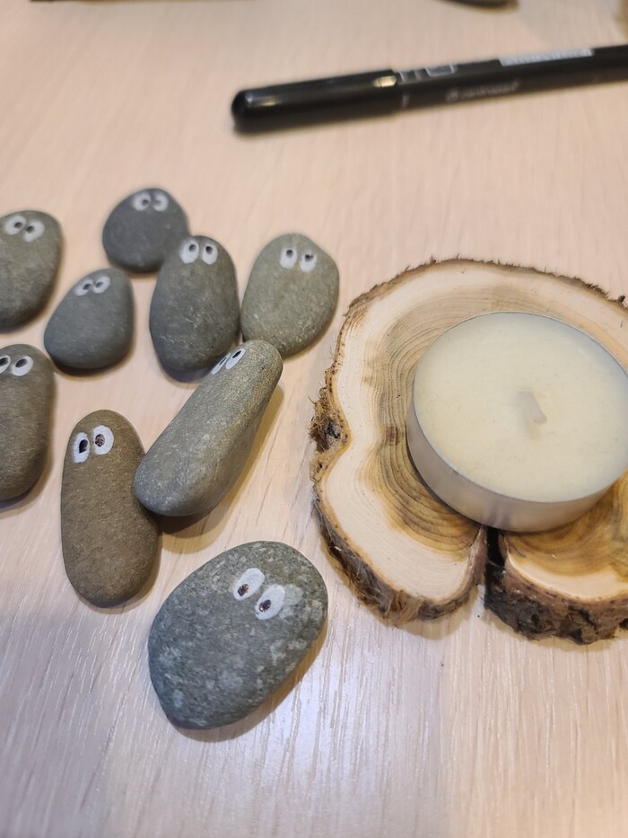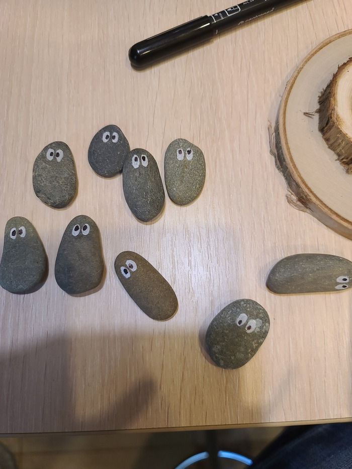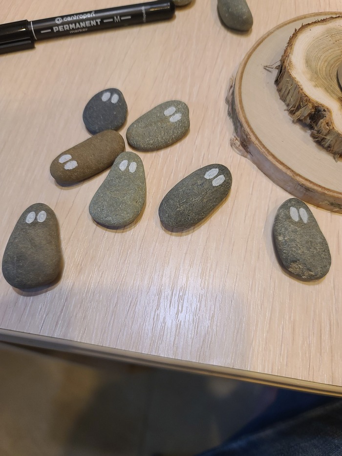 У нас в лесу, оформляя пруд, насыпали немного гальки. Небольшой по размеру. Максимум 40 мм. Видел где-то такую поделку и решил сам сделать. Набрал гальки, возвращаясь с пруда купил маркеры. Белый и черный. Спермопистолет был у меня дома)))