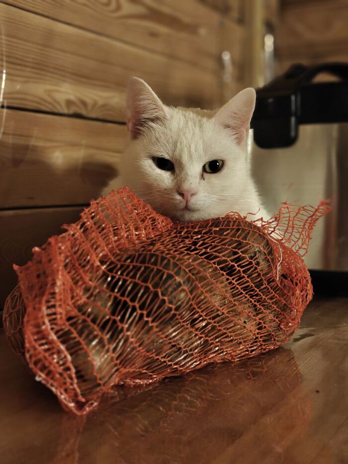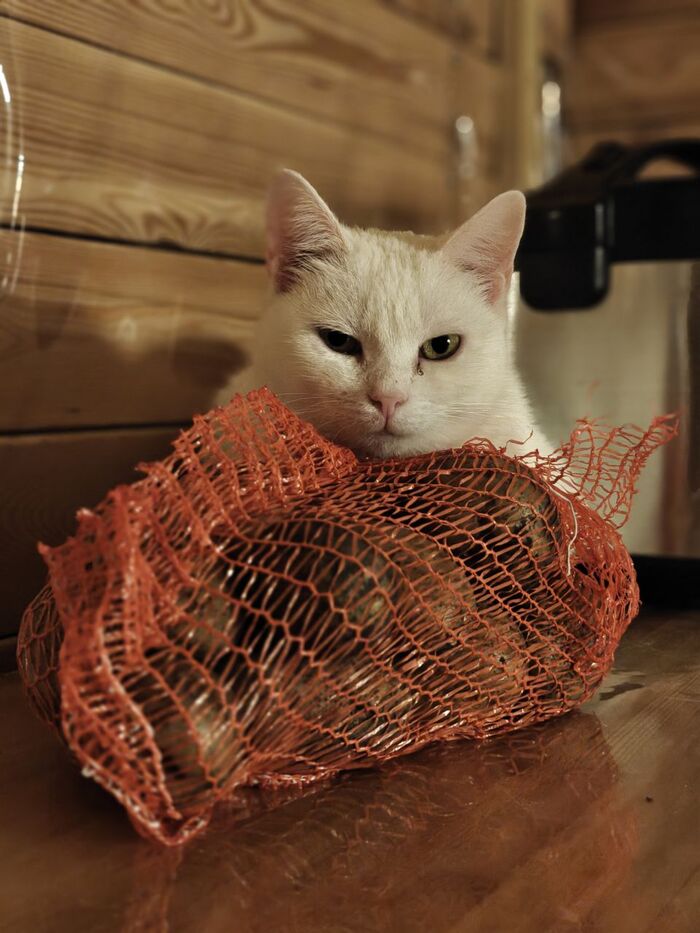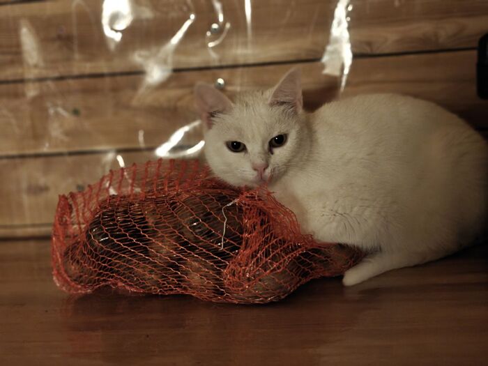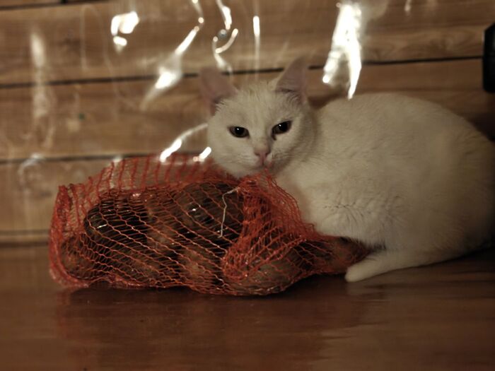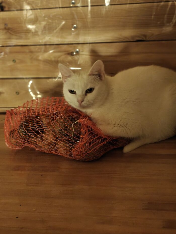 Кличка кошки Сырная Полиция. Она попала ко мне с дач с фиговом состоянии. Вчера она сказала, что она не кошка, а картошка. Поэтому была временно переименована в Белорусскую Полицию.