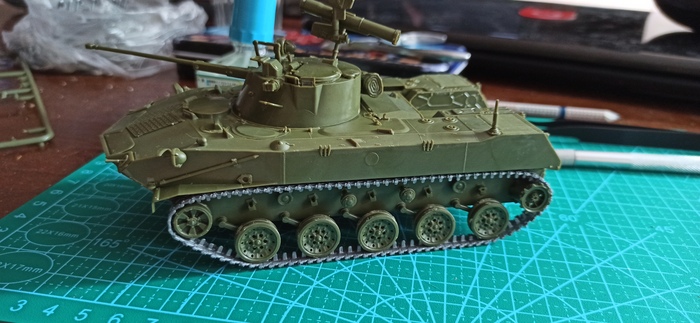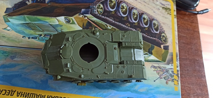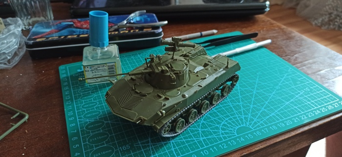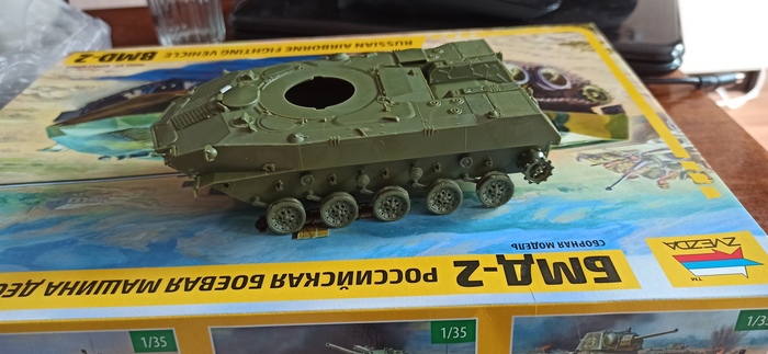 Было решено съездить в специализированный магазин, поглазеть и вообще найти конкретную модельку. Хотелось начать с БМД-1, но по прибытии в магазин меня ждало разочарование. Оказывается такие модельки были давно и не очень большим тиражом. Пришлось взять БМД-2 от звезды, масштаб 1/35. Открыв коробку меня ждал страх в глазах, много мелких деталей, а вдруг я что-то не так приклею, сломаю. Но ничего, глаза боятся - руки делают. Клей, кстати, купил по совету продавца, мне как новичку понравился. Стоит в районе 500 рублей, можно складывать детали а кисть с клеем подносить к месту крепления, он сам растекается по шву. Потратил я на всё это два дня. В некоторых моментах меня путала инструкция, но их было всего два. По инструкции есть отметки, на деталях их нет. Но ничего страшного, они достаточно мелкие и их будет не заметно. В целом сборка прошла успешно, мне понравилось. В процессе меня постила мысль, а если взять башню от модели БМП-1 и поставить её на БМД-2, то может получиться то что я хотел. Потом дособрать ещё одну "двойку". Впереди ещё покраска. В этом я вообще не шарю. Скорее всего этим будет заниматься @KANTESITA. Спасибо большое что дочитали, можете судить строго. Если вы уже средний ,или даже мастер, по сборке таких моделек, прошу прощения за корявость попавшую вам в глаза. P. S. Подскажите, может ли прокатить трюк с заменой башни?