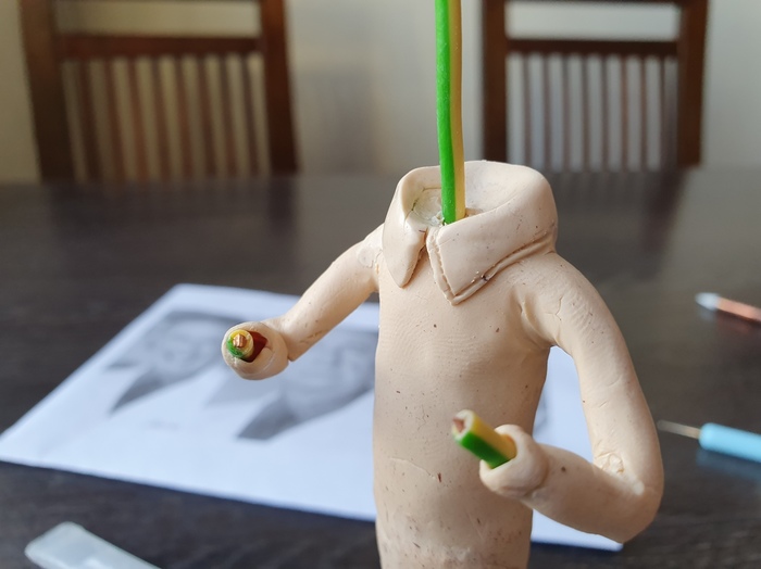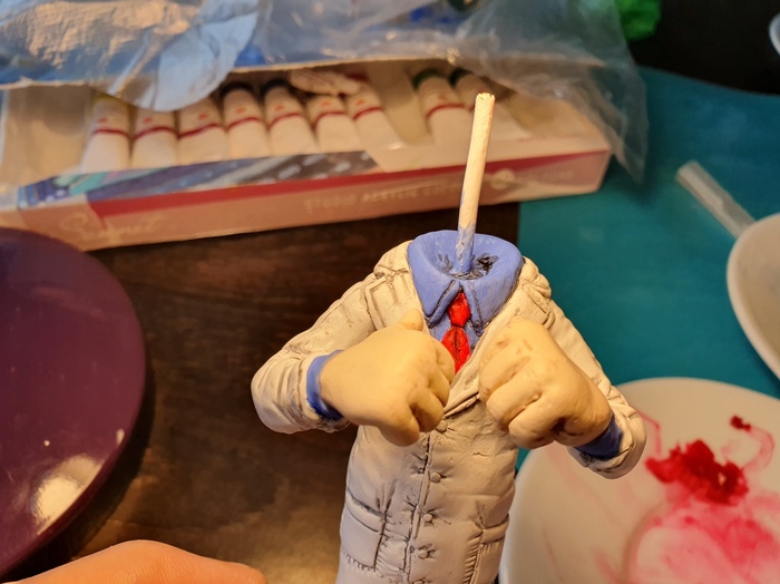 За тем, слпил галстук, а из тельца начал готовить глиняное бурито.