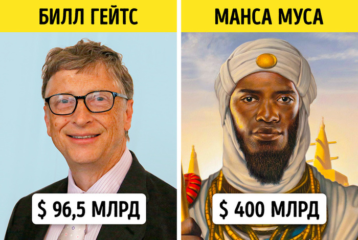 Был и Манса Муса, лично владевший всей золотодобывающей промышленностью Африки. В 1324 году он отправился в Мекку, взяв 12 тонн золота на дорожные расходы. Предполагается, что его состояние на современные деньги составляло 400-500 миллиардов долларов. Но есть источники, которые утверждают, что Муса очень много золота занимал, так что трудно сказать, сколько принадлежало лично ему.