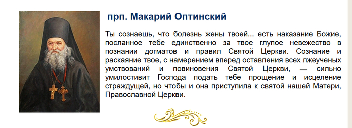 Ты сознаешь, что болезнь жены твоей... есть наказание Божие, посланное тебе единственно за твое глупое невежество в познании догматов и правил Святой Церкви.