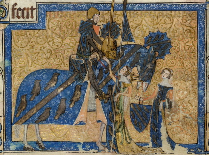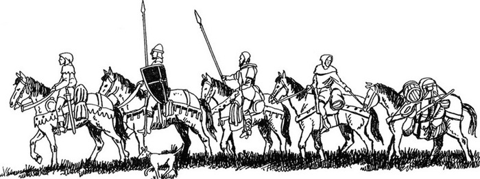 1.Дестриер или боевой конь. 2.Рыцарь на парадном коне или иноходце. Иноходь — аллюр гораздо менее утомительный для седока — достигался дрессировкой или использованием естественных качеств лошади. 3.Оруженосец вёз шлем, щит и копьё рыцаря. Он едет на руссине или ронсине, небольшом боевом коне. Его собственный шлем — барбют — привязан позади седла.