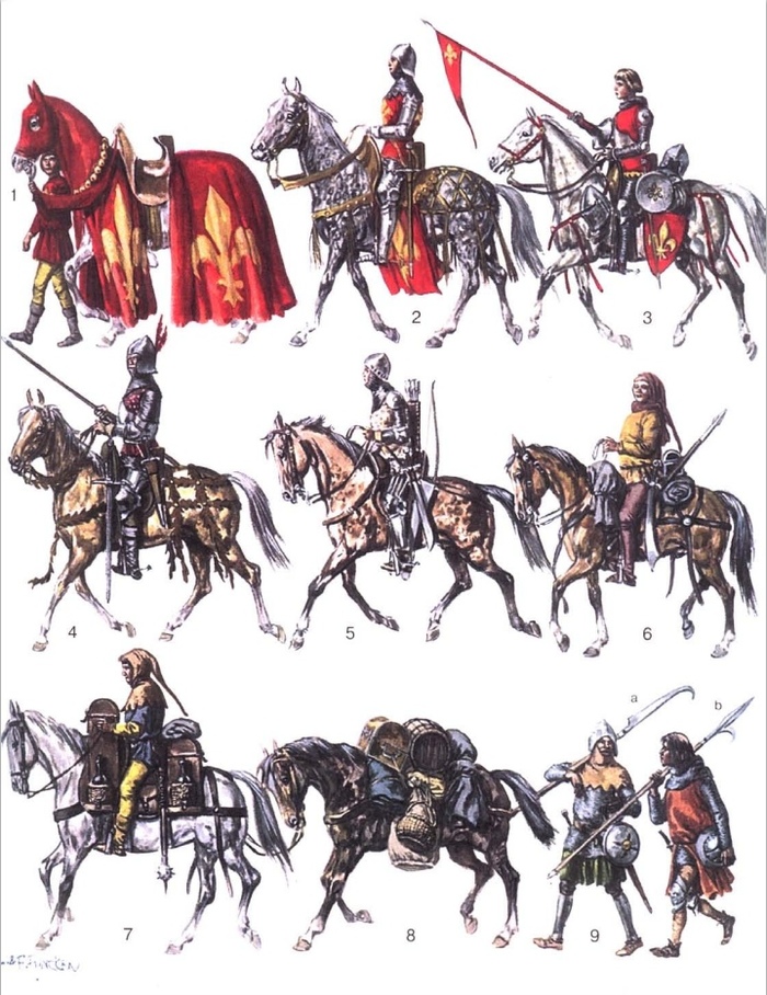 4.Кутилье, верхом на боёвом коне(курсьере), роде парадного коня быстрого и сильного. Он вооружен кутилем, оружием, средним между датой и мечом, которое служило для перерезания горла пленникам, отказывающимся платить выкуп. 5.Один из шести лучников верхом на лошади с подрезанным хвостом, вооруженный бракемартом, происходящим от восточного симетерра. В слегка изогнутом варианте он назывался боделером. 6.Слуга на своей лошадке. Он вооружён пикой и боделером, называвшимся также кутеласом. 7.«Иноходец с чарками» — кобылка, везущая специальный погребец с провизией для рыцаря. Воины ездили только на конях.