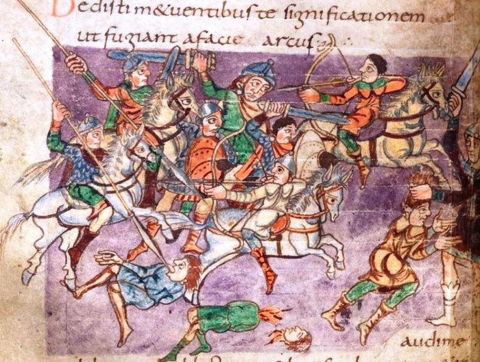 Франки верхом преследуют кочевников-аваров. Миниатюра Штутгартской Псалтыри, около 825 года.