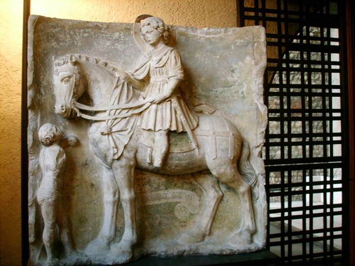 Святой Мартин изображён в виде всадника, сидящего на рыцарской лошади. Верона, 1436 год. Обратите внимание на рост и массивные пропорции лошади.