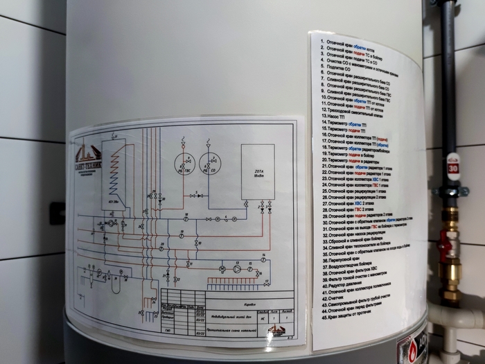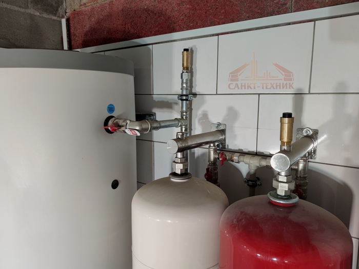 Сердцем всей системы является одноконтурный газовый котёл Baxi. Он нагревает, как систему отопления, так и воду в бойлере, подавая туда для этого максимально нагретый теплоноситель по приоритету.