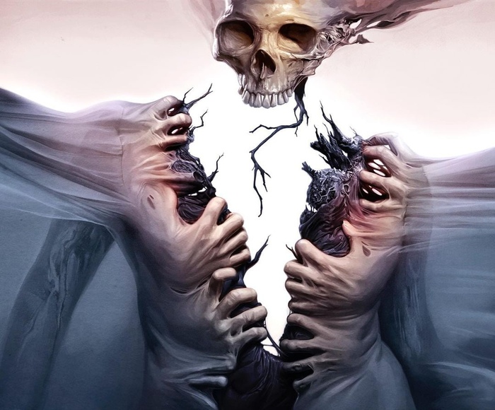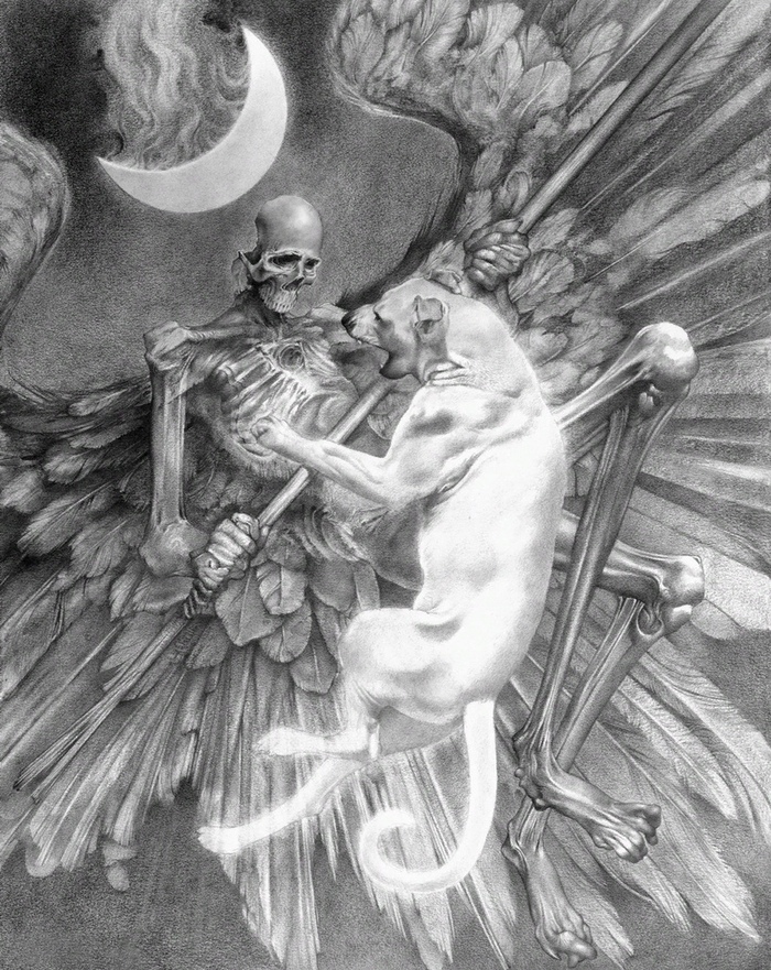 Может, архангел Саракуиэль - нам с вами более знакомый, как некто "Барон Селестиал" - и продолжал бы озвучивать свои "божественные титулы" и прочее - но голова взбесившегося ангела целиком пропала из виду, в поразительно огромной пасти Скора. Только нечеловеческая сила Высшего, позволила ему каким-то необъяснимым образом вырваться из смертельной ловушки. Оттолкнув что было мочи от себя "нашего" монстра - вылезающие из орбит глаза Барона Селестиала, смогли лицезреть громадную пастью, с кошмарным клацаньем захлопнувшуюся перед его носом. Точнее, в том месте, где должен был находиться нос. Ведь одержимо рычащий Скор, едва приметно сглотнул, продолжая утробно хрипеть и наступать на ангела. Рука Саракуиэль порывисто взметнулась к лицу, и пальцы его ощутили обжигающе горячее прикосновение. Лишенный лица, чуть больше чем полностью, с пугающе кровоточащими ранами - сочившимися жизненной влагой - ангел не мог оторвать взгляда лишенных век глаз - от своей ладони, полностью обагренной испаряющейся на воздухе кровью. Если подобное состояние можно было с натяжкой назвать шоком - то это был именно он. Уж что там в голове у Высших творится, представить трудно…