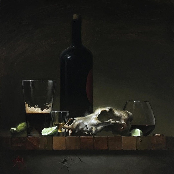 Однажды, когда я гулял по городу, то заметил на одном из окон необычную композицию. Там, на подоконнике, было открытое шампанское, два бокала, виноград, цветы и яблоки. Это было так красиво, что я решил нарисовать это и поделиться своим восхищением со всем миром.