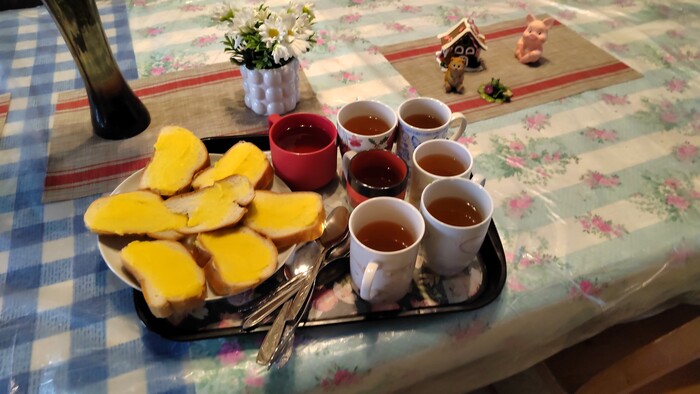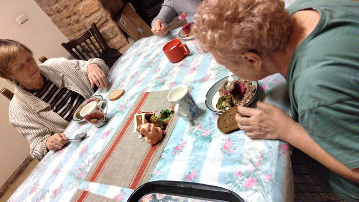 Итак, всех подняла, отконтролила туалет, душ, чистая одежда и я пулей в низ на первый этаж готовить завтрак: бутерброды, свежий чай с мятой ,кашка, украшенная фруктами или джемами ,каждое утро каша разная разная, сладости. Все собрались- аллилуя, проводить, рассадить, снять фото и видио для родных, далее нагрузить подносы для тех, кто кушает в комнатах. С этим отправила сиделок, сама сижу с моими за столом, во избежание -поперхнулся, не доел или взял чужое, поэтому сижу с ними пока кушают.