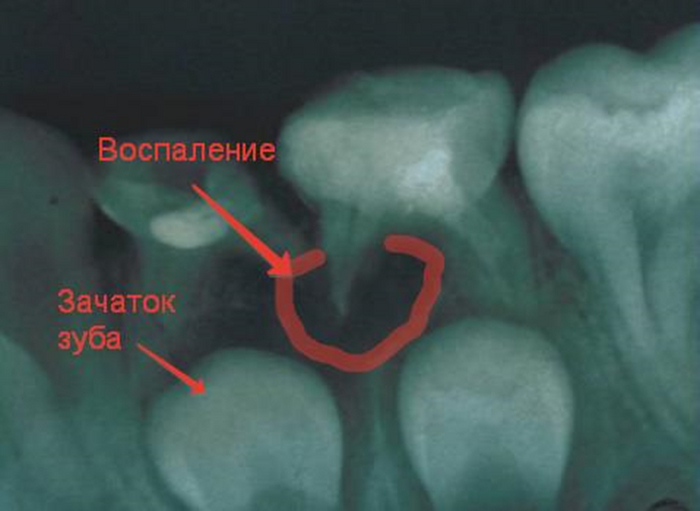 Только новый зуб вырастает не сам по себе из воздуха, а из зубного зачатка, который расположен четко под воспалением корня.