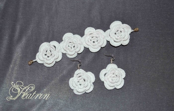 Но, этого показалось мало. Рисунок настолько понравился, что создала ещё одну работу - удлинённое болеро. Дополнить можно комплектом "розочка": вязаные серьги, браслет и брошка, просто и оригинально.