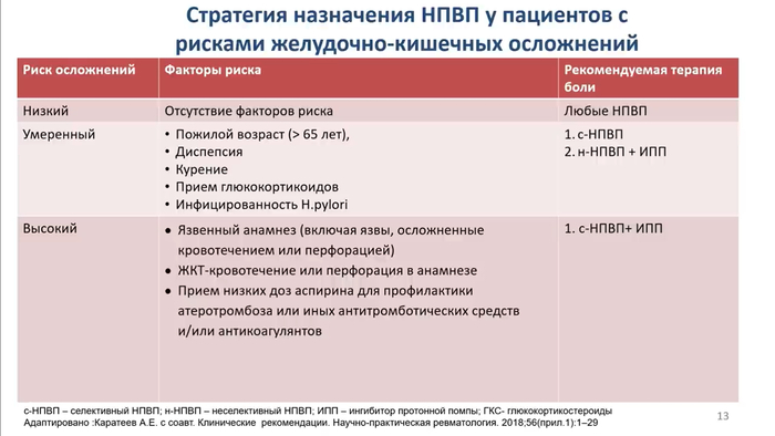 НПВП – при боли; предпочтительны селективные ингибиторы ЦОГ-2, при рисках ССС НПВП крайне нежелательны, крайне, любые. Разные НПВП не смешиваются друг с другом. Принимаем только один вид НПВП! Пероральные формы предпочтительнее параэнтеральных (уколов)!