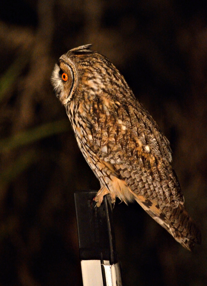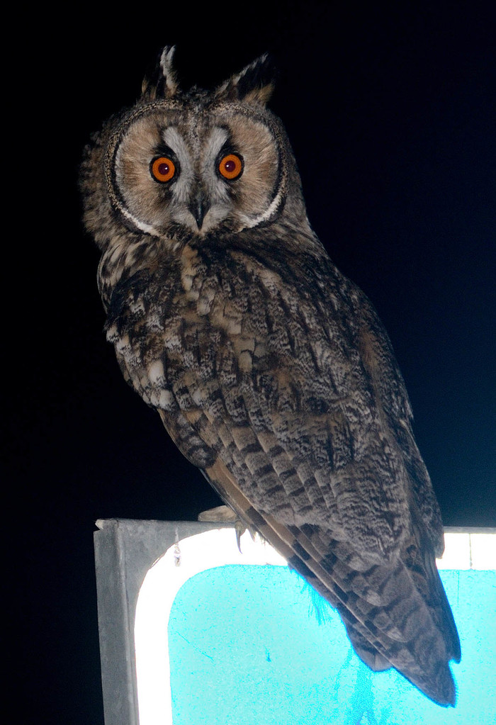 А это ее ближайшая родня - ушастая сова. Эта предпочитает на грешную землю лишний раз не спускаться и старается охотиться с присады. Хотя бы с дорожного указателя. Глаза у нее действительно оранжевые, в отличие от желтых глаз болотной совы. Причем, чем старше сова, тем темнее оттенок. Глаза не так подведены темными тенями. Ну и "уши", конечно, гораздо больше. "Ушастина" встречается на этих дорогах реже - наверное, раз в двадцать реже, чем болотная.