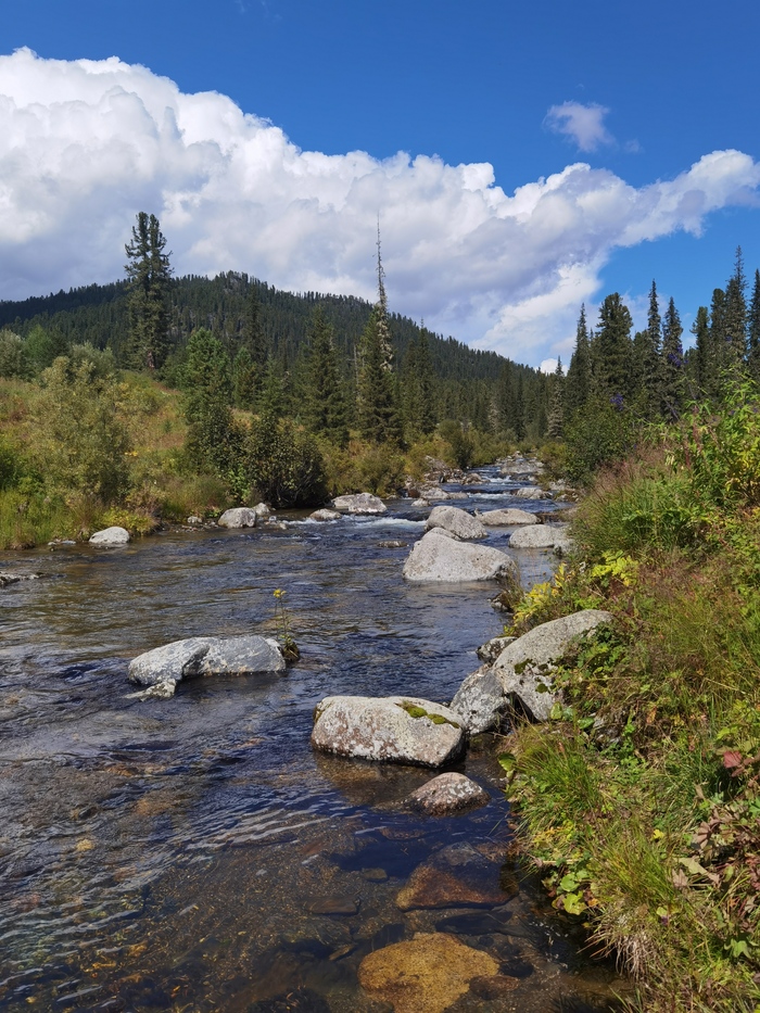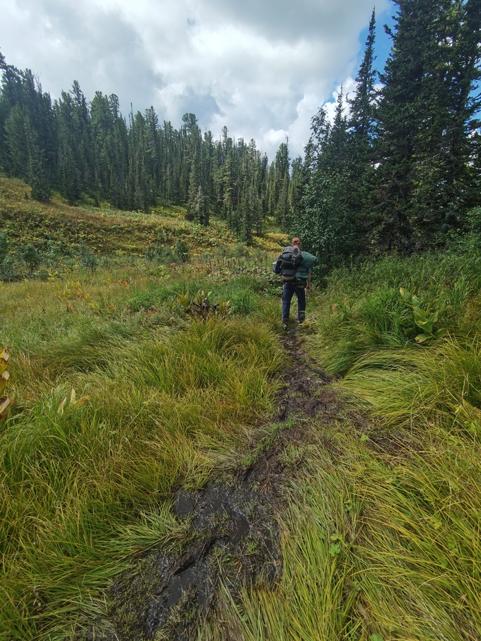 Тропа хорошо протоптана, сначала она лежала через лес. Кругом кедры, лиственницы, подлеска почти нет. Трава мокрая от вчерашнего ночного ливня. По простой тропинке идти весьма приятно после того, что было с нами вчера. Почти как на прогулке в парке.