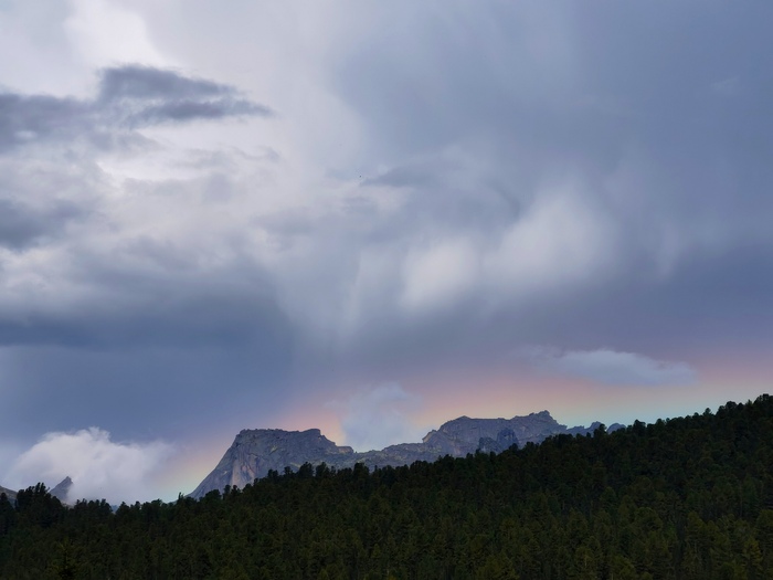 Сидели, кушали, почти как цивилизованные люди, на скамейке и под крышей. Смотрели на дождь и тучи, смотрели как всю непогоду уносит к Саяну, а у нас снова есть просветы меж облаков, а с ними и немного солнышка. И это солнышко дало нам очередное невероятное зрелище – радужные облака. При чем аккурат за Спящим Саяном!