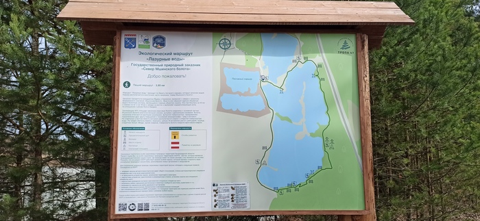 Экомаршрут "Лазурные воды" расположен в заказнике "Север Мшинского болота" и представляет из себя кольцевую тропу вокруг водоёма протяженностью около 4км.