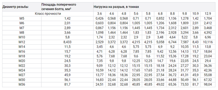 Ниже представлена таблица прочности болтов и нагрузки, которую они могут выдержать в зависимости от диаметра резьбы, площади поперечного сечения болта и класса прочности.