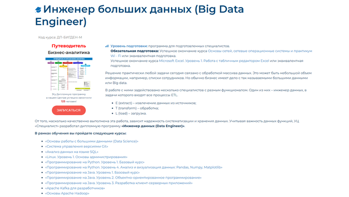 Курс готовит специалистов по работе с большими объемами данных и позволяет им освоить все необходимые инструменты в достаточно сжатые сроки. Студенты изучают особенности хранилищ big data, способы их обработки и подготовки для ML-инженеров и других отделов и т. д. Таким образом, программа рассчитана на то, чтобы они приобрели фундаментальные навыки работы в дата-инженерии, и быстро нашли работу в этой сфере.