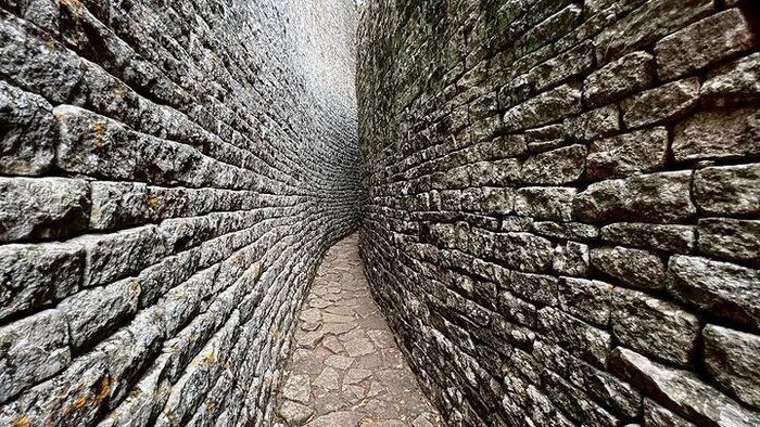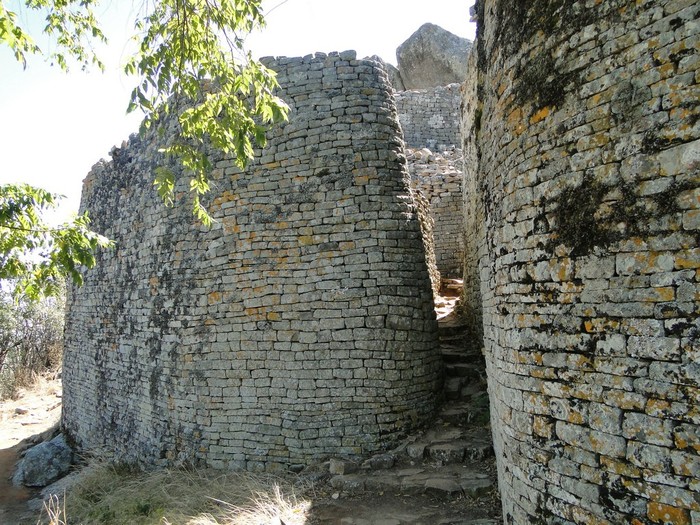 Три узких прохода в стене ведут на внутреннюю территорию, разгороженную другими каменными стенами и переходами. Самое любопытное сооружение Большого городища - коническая башня возле внешней стены. Этот превосходный образец строительства методом сухой кладки возвышается на 9 м, длина его окружности у основания 17 м. Своей формой башня напоминает зернохранилище крестьян местного племени шона, но из-за его абсолютной монолитности назначение сооружения представляет для археологов неразрешимую загадку.