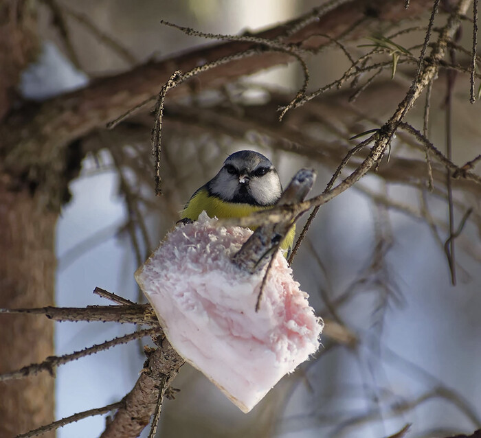 И вот настало время синиц. Причём вся тусня пришлась на 3 кормушки.