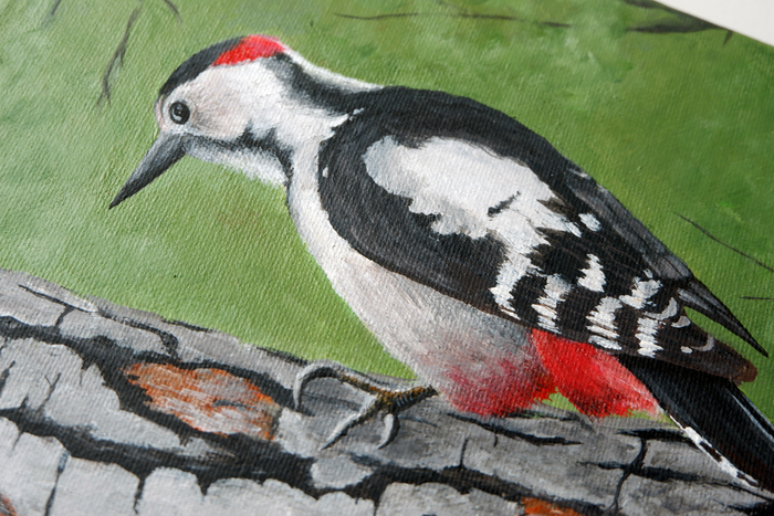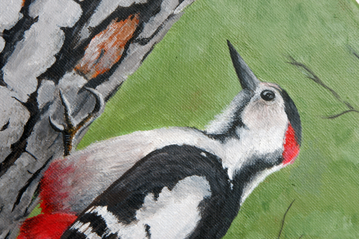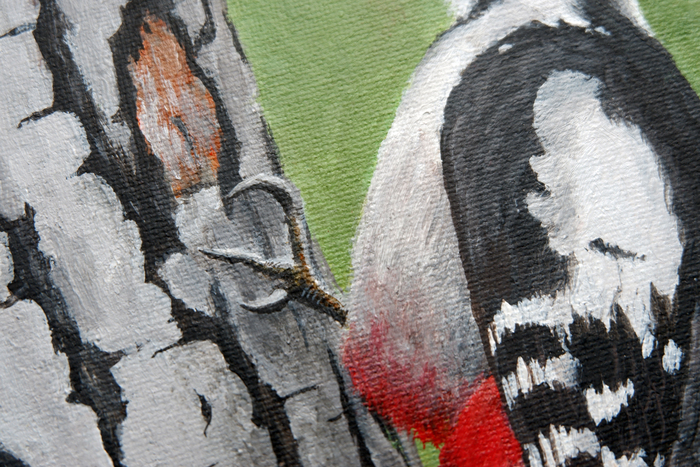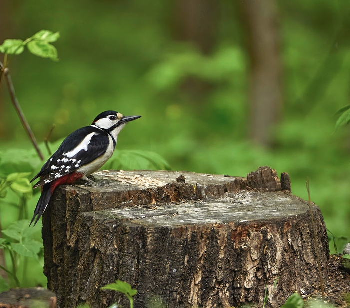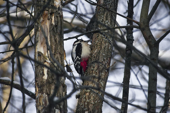 Как всегда отдельно ото всех сидел большой пёстрый дятел. Он настолько неподвижно сидел на дереве, что я начал подозревать, что дятел замёрз насмерть. Но нет, как только мы отошли подальше-так дятел сразу ожил и спустился к еде.