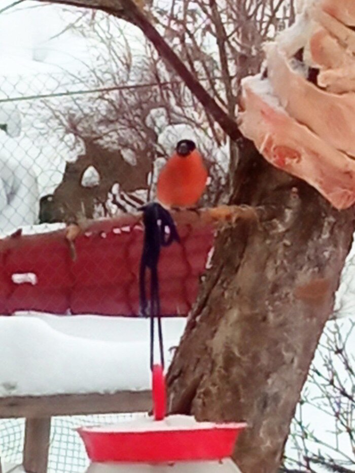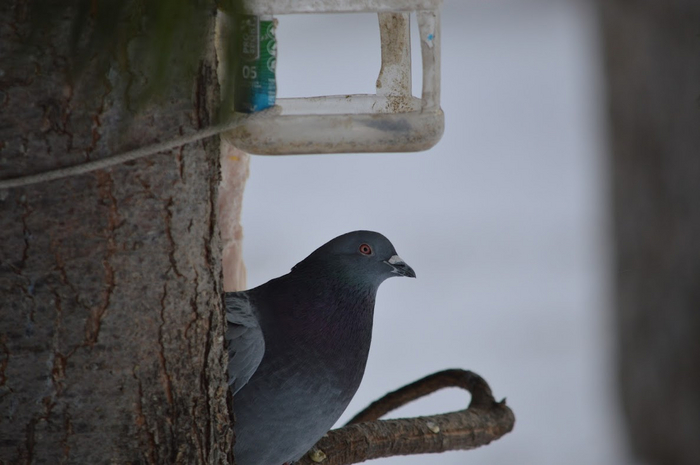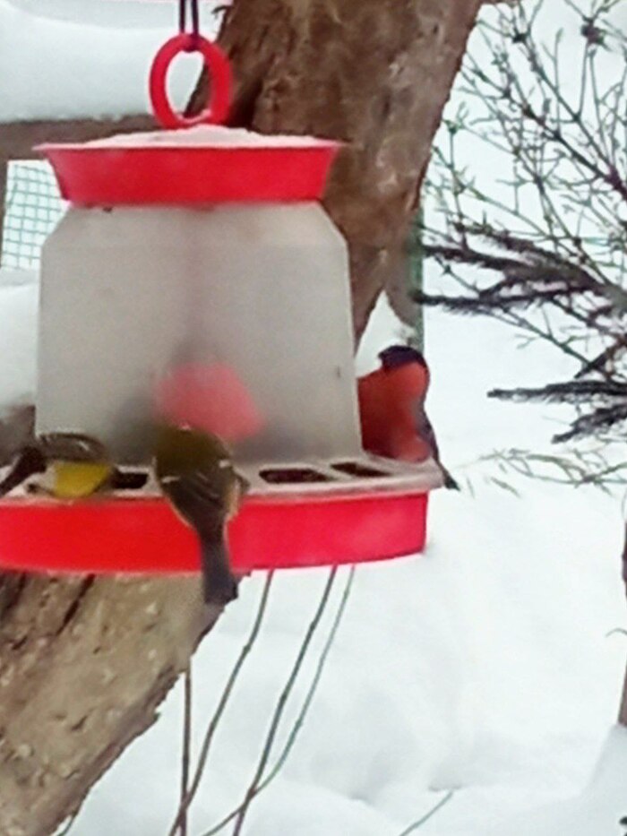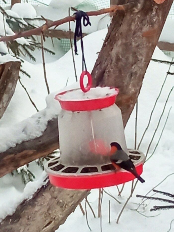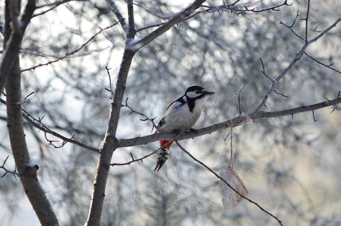 Рождество у нас выдалось очень морозное, на кормушке был аншлаг. Вот и дятел наведался. Большой пестрый. Самочка.🙂