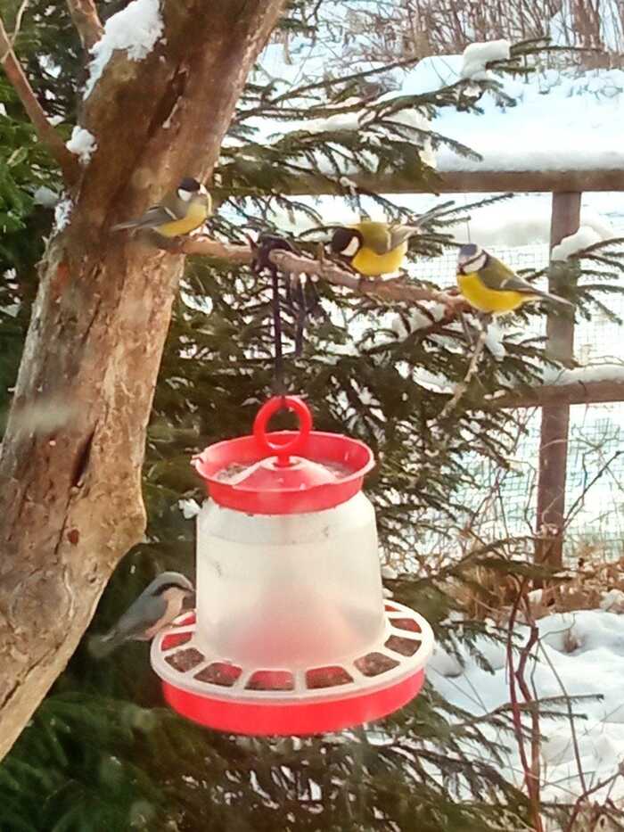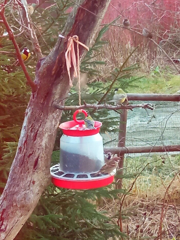 1. Прилетают синички двух видов, воробьи, дятел, поползень и одни раз прилетал хищник и дубонос.