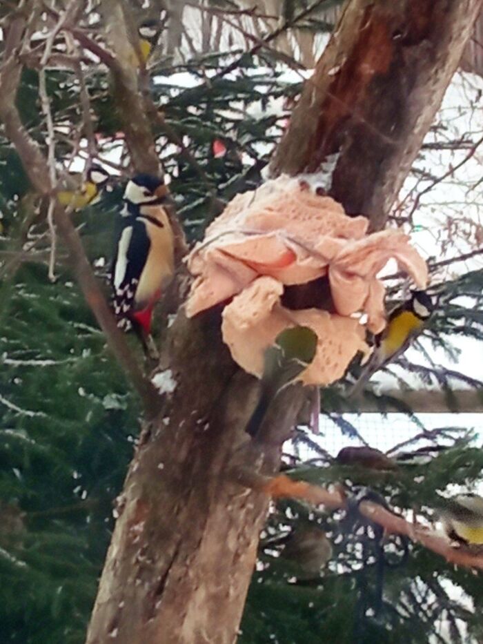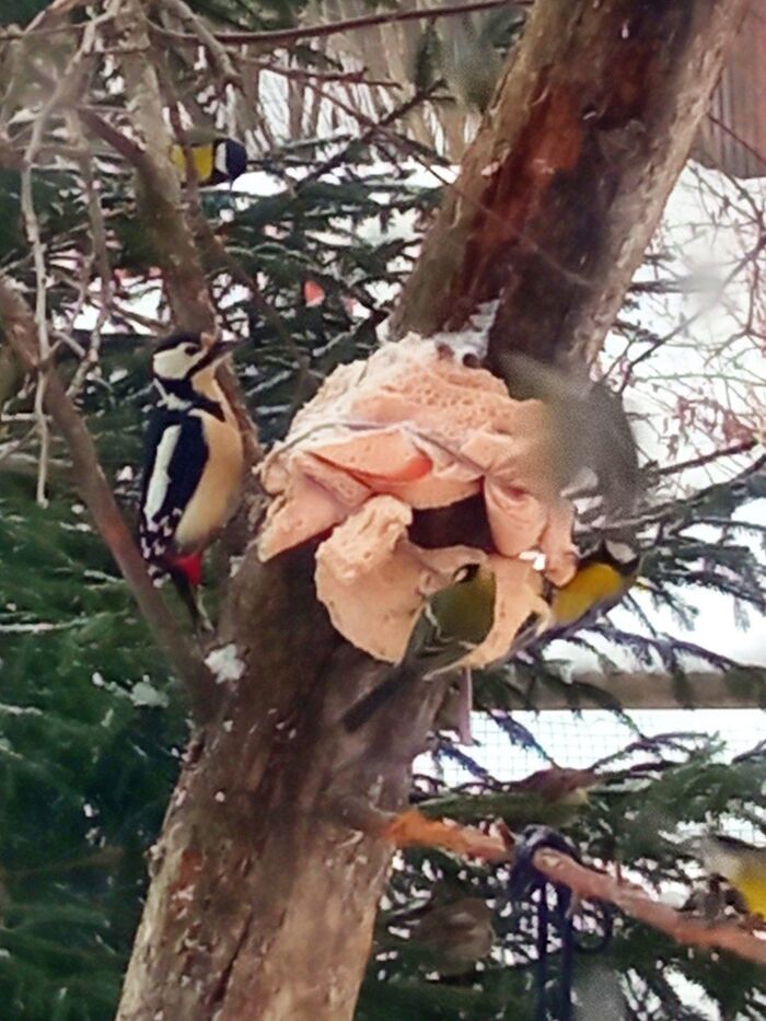 Большой пёстрый дятел выбирает сало. Сало-сила, спорт-могила.