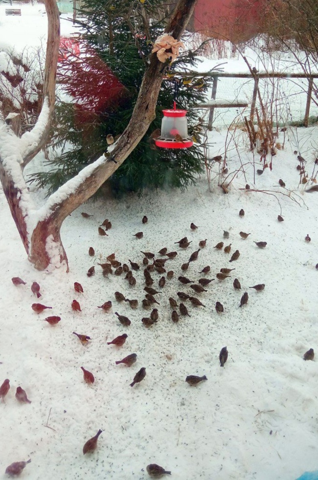 У нас всё завалило. СНТ пустое, поэтому столько птиц. Когда было мало снега, птиц тоже было гораздо меньше.