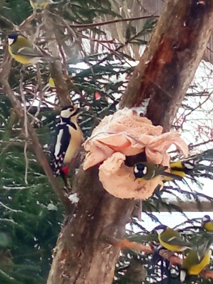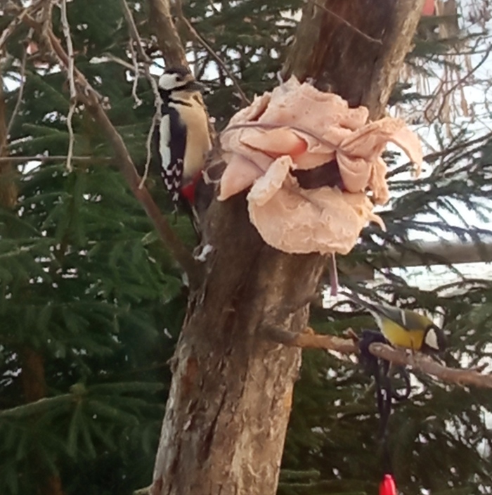 Большой пёстрый дятел показывает большим синицам, что его большесть больше синичной. Так как сала не оказалось-то пришлось довольствоваться семечками.