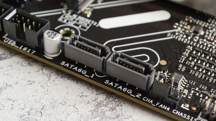 Пара SATA-разъемов расположилась вдоль нижнего края платы.