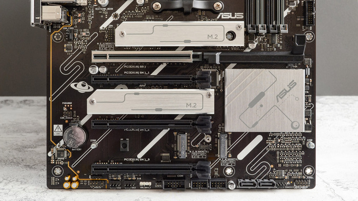 Всего же на плате ASUS Prime X870-P WIFI размещено 4 слота M.2. Верхний M.2 запитан от процессорных линий и интерфейсе PCIe 5.0 x4 (или 4.0 c урезанными процессорами). Второй и третий слоты могут работать только на PCIe 4.0 x4 и ниже, а четвертый слот мало того, что умеет не выше PCIe 3.0 x2, так еще и делит линии с разъемами SATA.