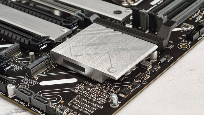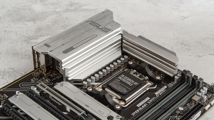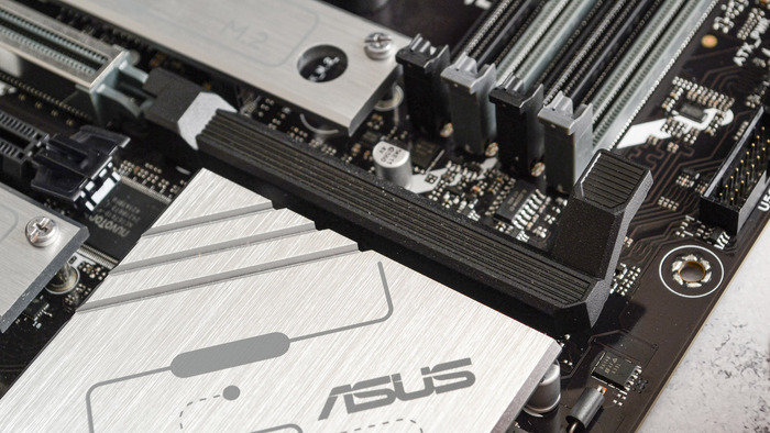 Цепи питания платы оснащены парой достаточно размашистых, но не очень массивных радиаторов. Производитель не стал мудрить с окраской (как и во всей линейке PRIME) и оставил радиаторы без покрытия – чистый алюминий. Теплоотвод осуществляется как со сборок, так и с дросселей. С ними металл радиаторов контактирует через посредников – темно-серые термопрокладки.
