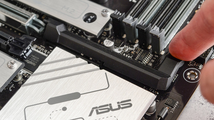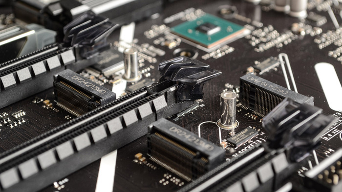 Плата оснащена четырьмя слотами оперативной памяти DDR5. Для удобства сборки производитель нанес прямо на текстолит последовательность установки модулей (сначала каналы A2 и B2). Максимально поддерживаемый объем ОЗУ – 256 ГБ, а заявленная частота работы – 8000+ МГц.