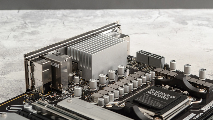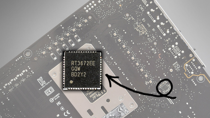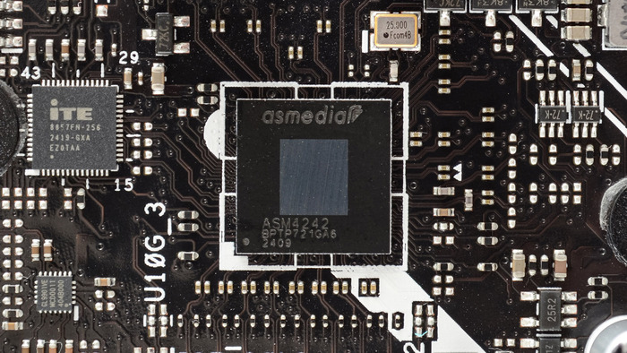 Под радиаторами VRM скрывается дополнительный теплоотвод, который невозможно было увидеть. Он охлаждает контроллер ASMedia ASM4242, отвечающий за USB4 с поддержкой DP 1.4a. Для материнских плат на чипсетах X870/X870E использование этого чипа с активным охлаждением стало стандартом де-факто.