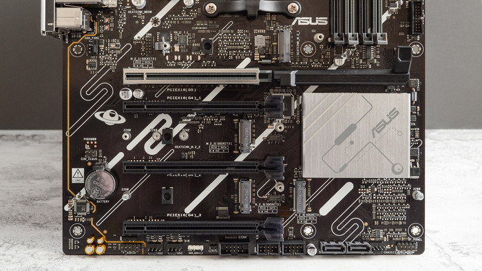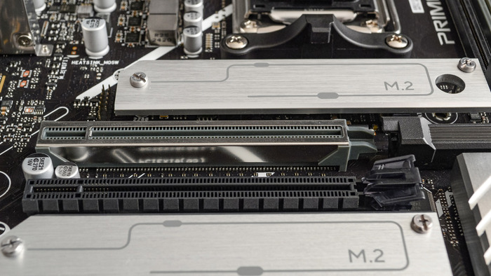 Стоит учитывать, что все дополнительные разъемы PCIe делят линии с разъемами M.2, т.е. будет работать либо одно, либо другое. Полноценно самостоятельные здесь лишь те, что сидят на процессорных (а не чипсетных) линиях: основной (верхний) PCIe 5.0 x16 и основной же (тоже верхний) разъем M.2 – PCIe 5.0 x4.